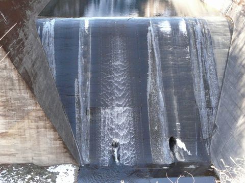 さて今度は・・・ って言うか「お約束」の場所。 小河内ダムの余水吐の前に来た自分。 ま、降ってから4日が経っちゃっていますからね!(涙) 周りの道路状況から考えても、殆ど残っていないとは思っていましたけど!! 陽の当たらない部分に薄っすらと雪が残っている程度で・・・ あとは溶けちゃっています(涙)。 ちなみに、この時の気温は4℃。 太陽が出ているので、比較的暖かい温度です! そして、雪はともかく・・・ 相変わらず、減勢工は水が溜まったまま・・・(詰) 年度内の土砂撤去工事は行わないのでしょうか?? 雪が降ったせいで水根沢の水位が増し・・・ 溢れ出る量も増えている感じです。 それが見事に凍結していて!!(冷) これで着雪していたら、結構凄いシーンが見れたはずなのに!!(悔) 仕方ないです! 更に奥地へと向かいます・・・