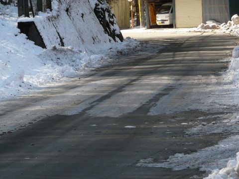 白銀の小菅村編・ファイナル!! 何故か微妙にアクセス数が多かった、このシリーズ!(驚) って言うか小菅村、隠れた人気者??(笑) ま、そんな事は置いといて! デジカメのバッテリーも、寒さのため限界が近づき・・・(焦) ついに赤ランプが点滅し始めてしまったので!!(困) あまり寄り道は出来ません!!(涙) 一気に「幻の小菅村スキー場跡」らしき斜面が見える場所に向かいます!!(急) ただし、小菅村の場合はね?(涙) 1回、雪が降っちゃうと中々溶けない場所が多いんですよ! 日当りが悪い場所が多くて!! くっ!!(噛) マジ微妙!!(泣) 轍の部分を上手く通れば! って言うか、ツンツン走りすれば簡単にクリアできると思いますが!! この先にも、同じような路面状況が待ち受けている危険性が高いです!!(涙) って言うか、この先は・・・ ちょっと無理っぽ!!(悔) ちなみに・・・ 画像だけを見ると、すぐ目の前の道路が凍結しているように見えるかもしれませんが・・・ 実際には、デジカメの望遠機能を使って100m以上も向こうの路面の画像を撮っています! だって、あまり近づくと、ターンできなくなる危険性がありますから! って言うか、ターンできるだけの道路幅が確保されていませんでしたし!!(焦) はぁ・・・ 例の斜面は、すぐソコ! 目の前の崖に生えている木の隙間から見え隠れしているのに!!(悔) 恐らく、距離的には500mも無いような位置!! 無理しちゃえば、確実に辿り着けるような距離ですが!! やはり、無理は絶対にダメです!!(悔) 悔しいですが・・・ って言うか、無理して辿り着いたらデジカメのバッテリーが終わってた(泣崩)なんてオチが待ち受けている危険性もありますしね!(笑) 仕方ないです! 今年、早くも2度目の撤退!! 後日、改めて来る事にします!! にしても小菅村。 今まで、何気に通り過ぎているだけでしたが! まだまだ何かが潜んでいる可能性が! 今年は、もう少し時間をかけて回ってみることにします・・・