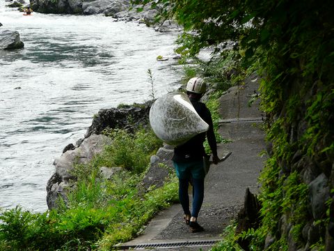 御岳渓谷編PART2。 巨大な楯を持って歩く・・・ じゃなくて! 御岳大橋よりの少し上流の辺りは、多摩川の流れが少し急な部分が多いため・・・ そして、渓谷内に転がる岩の関係で、複雑な流れをする部分が多いため・・・ この手のカヌー(?) って言うか、正式な名称を知らないので、これらの船の名前が何と言うのか知らないのですが・・・(恥) ま、とりあえずカヌーと言う事にして!!(誤) それを担いで川沿いの遊歩道を歩いている人の姿を良く見かけます! そして勿論!! 川では果敢に急流に挑んでいる人たちの姿が見受けられます! 流れの緩やかなところに一旦隠れ・・・ タイミングを見計らって一気に川を遡る!(凄) 場合によっては、流されずに同じ位置をキープし続ける!! 夏場は、見ていると涼しそうで良いのですが・・・ コレ、結構体力を使いそうですね!(腕) そして! 都区内や川崎市に住む人は・・・ コレが多摩川の光景といわれても信じられないような気が!!(笑) 御岳渓谷。 こんな場所もあるんです・・・