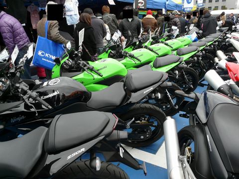 毎年・・・ とは言え、ここ数年は不発続きですが!(泣) 意外なレア物や、ネタになるバイクが売りに出されることが多い東京モーターサイクルショーの中古車即売会!! が! 今年は!!(滝涙) ここまで酷いのは・・・ 東京モーターサイクルショーが最悪期を迎えていた90年代。 東館で開催されていた時期に戻ってしまったかのような内容です!! って言うか今回は! 中古車と銘打った、新古車の即売会に成り下がっていましたし!!(怒) 去年発売されたばかりのVTR250(FI仕様)や・・・ CB400SF。 更には!! 大量のNinja250R。 タイヤ・・・ 全然減っていません! って言うか、真ん中は移動させるときに減った跡がありますが、ソコ以外は使った形跡がありません! って言うか、表面の皮が残ってるし!! って言うか・・・ とりあえず政策的にナンバープレートを取得しただけで、全く走っていない新車! メーカーの営業さんから(販売ノルマを)押し付けられた? あるいは年間契約で、買わなければいけない台数枠で購入せざるを得なかった新車をディーラー登録して、新古車として売る! そしてメーカーサイドでは「今月の登録台数は☆☆台になりました!(対前年比★★%)」と発表するために押し付けたバイク! って言うか、それが現実です! もちろん4輪の方も! 特にH社のやり方は汚いですからね! あの会社の発表する数字だけは絶対に信用できませんから! 4輪のT社ははエグイだけですが(困) 4輪と2輪を売るH社は・・・ ちなみに! 今、一番苦境に立っているY社。 以前は「押し付けの帝王」として成り立っていました! ただし、最近のことは知りません! って言うか、あそこまで販売低迷していると言う事は、過去の販売方法を止めた事だと思いますが・・・ ま、そんな事はさておき・・・ とにかく! (色んな意味で)悲しみに包まれた新古車即売会中古車会場となってしまったのが残念です。