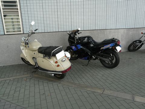 さて今回、あのプロジェクトを開催したのは・・・ 自分が借りているレンタルBOXの谷間です! ちょうど、コンテナとコンテナの間。 すの隙間を利用して! とは言え、真横からモロに見えちゃうのが最大の欠点ですが、2方向を塞いでいる分、何とかなるはず! でもとにかく! 時間との勝負なのは確かです! しかも・・・ 久々の晴れだったので、洗濯物とか布団干しとかしていたので、スタート時間が10:30になっちゃいました!(遅) 辺りには、結構人が歩いていたりします。 そして隣の駐車場には、買い物に出かける人達が出入する危険性が!! あんなところを見られたら! 通報されることは無いにしろ・・・ ママー、あのオジチャン何してるの? しっ、ダメよ目を合わせちゃ!!(逃) みたいな空気が漂いまくるのは確実!!(滝汗) とにかく、人が来ないことを祈りつつ、作業を進めます! と同時に・・・ 付けてて良かったセンタースタンド!(笑) これで作業性アップです! なお、念のために言っておきますよ! このためにセンタースタンドを付けた訳ではありませんからね!! まずは最初に・・・ 今回は、折り紙のリングは使いません! 100円ショップで買った装飾用のリボンを使います!! それを色々な位置を検討しながらビニールテープで固定していきます! まだこの状態で人に見られても、そんなには恥ずかしくない・・・ たぶん! と心に言い聞かせながら、作業は進みます!! つづく。