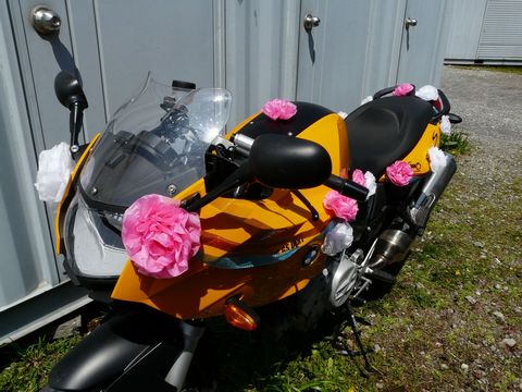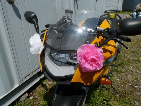 花の飾り付けが着々と進む中・・・ 一つ、重大なことに気付いた自分!(困) 花を作っているときは、赤白12個ずつあれば十分だろうと予測していたんですけどね・・・ いざ作業を始めてみたら! って言うか、鳩サブレ号の時は、合計で15個くらいで十分だったのに! エフハチの車体の大きさを考慮するのを完全に忘れていました!(汗) 実際・・・ 画像の丸の位置付近にも花を付けたほうが見栄えがするのに!(悔) 今から新しく花を作っている時間はありません! って言うか、そんな事をしていたら絶対に誰かに見られてしまう!!(恥) そんな中・・・(焦) なんか、チビッコ達の声が聞こえてきたんですけど!(滝汗) って言うか、チビッコ達だけは勘弁して!(願) と、思いつつも作業を急ぎます! 花が少ないのは悔しいけど!!(涙) これから最後の仕上げに入ります! それにしても1年半でお別れとは・・・(涙) 本当に短かったよね? 走ったのも9900km・・・ って、あと100kmで1万キロなのに!! とは言え中古で買ったので、総走行距離は11350kmになっていますけど! 本当に、軽くて乗りやすくて、しかも燃費が良いし、ブレーキも良く効く!(凄) さらに、コーナーではアクセルのオンオフだけで勝手に曲がってくれるし! 長距離走っても全然疲れない! って言うか400km程度の走行距離だと、走った気にならないというか!! さらに、本当に800ccあるのか疑いたくなるような燃費の良さ! 下手な250ccよりも燃費が良いですからね!! しかも、安いほうのガソリン(レギュラーガソリン)でもノッキングせずに走ってくれるところが、お財布にも優しくて!! ああ、あともう一息で最後の飾り付けが終わっちゃうのか・・・(涙) 花の数が少なかったのが悔しいけど!! つづく