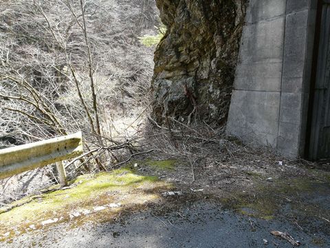 中津川に旧道を見た編? 名も無き(?)内面鉄板張りのトンネルを抜けると・・・ って、画像は、反対側の抗門です。 う~ん・・・ これで素堀りなら最高なのになぁ!(悔) なんて思いながら眺めていたらですよ! トンネル出入り口の脇。 何か様子がヘン? って言うか!!(叫) こ、これは! トンネルが出来る前の旧道の旧道の跡!!(凄) 今ではすっかり崩落と枯れ木の山に埋もれていますが!(涙) しっかりと、人が切り開いた「平らな道」が付いていた跡が残っています!! ただ・・・ あまりの荒れ具合に、通るのは困難を極めそうな感じ!!(悔) ついでに入口側に戻り・・・ 反対側の旧旧道の付け根を確認すると!! 確かに、こちらにも道の跡が残っています! が!!(泣) すぐ先で完全に崩れ落ちていて、進むことが出来ません!(悔) 道幅から言って、この中津川に自動車が通れるようになる前に使われていた道。 この奥にある鉱山に住む人たちも使ったかもしれない道。 この辺り、非常に岩盤が脆く崩れやすい場所。 昭和以前の人達は、こんな場所を通っていたんですね!(凄) この辺り。 時間をかけて色々と探すと、何か面白そうなものが出てきそうです!!(涎) 今シーズンは時間的に無理かもしれませんが・・・ 来シーズン。 今度は徒歩で探索に来てみると面白いかもしれません! つづく。