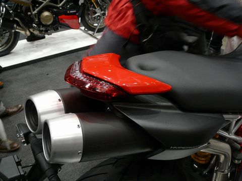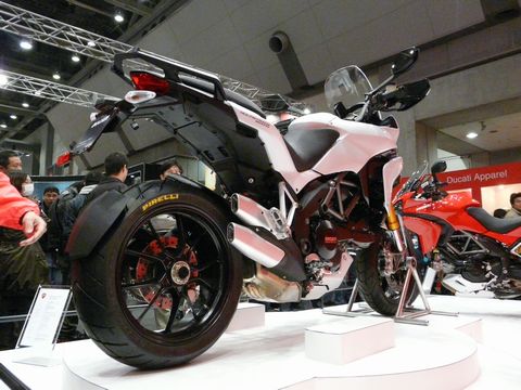 東京モーターサイクルショー編2010。 実はドゥカティブース内で、もう一つ気付かずに終わっちゃいそうな新型があったんです!(汗) スポーツタイプのバイクなら使用するレースの排気量に合わせて、先に大きいのを出してから・・・ 全く同じ形で、排気量のみ小さいのを出すことが多いドゥカティ。 場合によっては、フレームも外装もそのままでエンジンだけ小さいなんて事が売りますからね! カラーリングをわざと変えるので、すぐに識別できるようにはなっているんですけど!! が・・・ 今回は、ちょっと事情が違います!(驚) ハイパーモタード896。 今から4年前。 ついにドゥカティがオフ車を出したのか?!(実際にはスーパーモタードですが) と驚かせた1台。 当初は1100ccだったのですが! 恐らく、フレームと外装はそのままで900ccのエンジンに乗せ換えた仕様のモノが追加になったんです!! って言うか、ココ10年くらいの傾向として・・・ 各メーカーとも無駄に排気量を上げようとしていたのに!(困) やっとデ・サイズが始まった?? ま・・・ 再びガソリンも高くなってきていますしね(涙) あまり排気量が上がると、使用するガソリンの量も排気量に比例して多くなりますし(滝涙) 黙っていても車重が増えますしね!(重) それに、パワーを持て余して事も多いですから! 小型化は嬉しいことです! って言うか、600cc~900cc位の排気量が一番バランスが取れていることが多いですからね!!(嬉) この車種追加は、個人的には歓迎することです! ただ・・・ まだ「見栄」を気にする日本人には受けが悪いんだろうなぁ???(涙) あまり売れずに消えていかないで欲しい気がするんですけどね!! なお自分は・・・ ドゥカは買うこと無いと思うので(困)。 その差を体験できることなく終わっちゃうのかと・・・