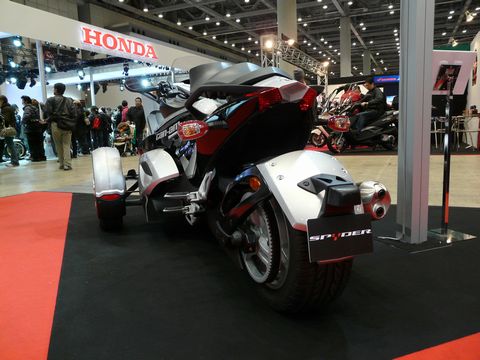 やっとバイクらしい物が出てくる東京モーターサイクルショー編2010。 とは言え・・・ 何か様子がちょっとヘン!(焦) 微妙に自動車(4輪)用のタイヤを履いてるし・・・(平) なんかヘンなところからフロントタイヤが見えてるし!(出) って!! しかもコレに乗るには、普通自動車免許(AT限定は不可)が要るらしいし!! って・・・ CAN-AM スパイダー SM-5。 ロータックス製の1000cc、Vツインエンジンを搭載した3輪車(と言って良いのか?)です! 何と! フロントにはトランクスペースも備えています! が、運転方法はバイクと全く同じように・・・ 右手でアクセルを操作し! 左手でクラッチ! 右足でブレーキ(前後連動らしい)! 左足でギア操作をします!! 細かいスペックは不明ですが・・・ おそらくバックギアは付いているのかと?? そして燃料タンクはシート下に25リッター! ちなみにタイミングベルト駆動だからメンテナンスフリー!? 発売時期や価格は不明ですが・・・ 何しろ貰ったカタログも英語のままでしたし・・・(困)