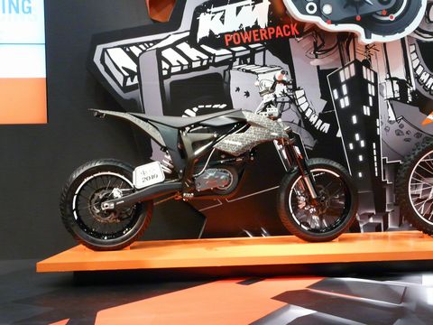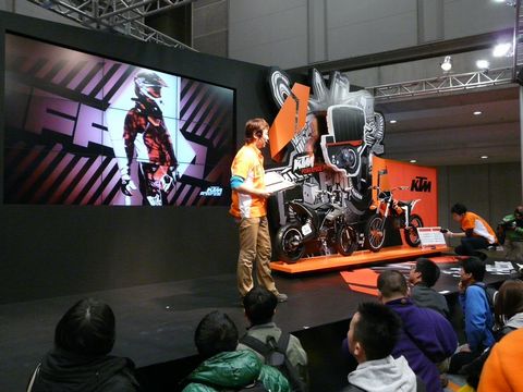 まだ続いている東京モーターサイクルショー編2010。 ドゥカティと共に大阪モーターサイクルショーへの出展をキャンセルしてきたKTM (悔) 東京にはですYO!! 全世界で初めて、とある2台のバイクを発表してきました! いや、一応、バイクなんでしょう? エンジン付いていないけど! エンジンの代わりにモーターが付いているけど・・・ って言うか電動バイク!! しかもですよ!! 驚くことに、6月には発売開始を目論んでいるのだとか!!(驚) その名はフリーライド オフロードとストリートの2種類があり・・・ 画像はオフロードの方! 家庭用電源を使って8時間でフル充電完了し! そして連続運転で、約1時間弱。 プロライダーの激しい運転で40分くらいは走れるそうです! ガソリンを使わないので、クリーンでエコな走りが出来るそうです!? とは言え・・・ エンデュローコースなどで、たった1時間しか走れないなんて!(涙) とお考えの貴方! そんな方のために、会場のスタッフの方たちが素晴らしい提案をしてくれました?? 普通・・・ 一般の人がエンデュローコースを走っても、せいぜい15分が限界!(笑) と言う事は「休み休み合間に充電していけば1日は十分に走れる!」と言う事なのですが・・・ ちょっと待て!(突) ちょっとツッコミ入れても良い??(困) 発電機。 持って行けるほど余裕のある人って、一体どれくらいいるの??(謎) 少なくとも、トランポやトラックを持っていないと、100v電源用の発電機なんて積めないんじゃないの?? 更に! 発電用にガソリン使っちゃったら、クリーンもエコも関係ないやん!!(排) コースに充電設備が整っていれば別ですけど・・・ って、そんなエンデュローコースなんて、まずありませんしね??? 面白そうなバイクだけに、その辺が物凄く疑問です?? ちなみに、AT仕様です! クラッチとミッションは付いていません! 一体、どんな走りをするのか? コレは物凄く興味があります! つづく。