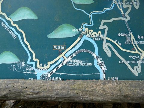 トロッコ保津峡駅に架かる吊橋を渡り対岸に到着すると・・・ う・・・(固) この付近一帯。 誰も住んでいないのに、この頑丈そうな分別ごみ収集箱は何??(謎) ま、確かに夏場の観光シーズンは、それなりの人が訪れるでしょうけど・・・ そして、嵯峨野観光鉄道が運行している期間中に滞在するスタッフの人や、橋の袂で細々と売店を営む人達はいますが・・・ コレだけの量をゴミを出すとは思えないんですけど!! って言うか、来るんだ? ココまで、ゴミ回収に!(凄) ま、そんな事はさて置き・・・ このゴミ収集箱の横に、古い観光地図が立てられています! って言うか最近。 この手の古い観光地図に注目し始めた自分。 意外にね! ネタが転がっていたりするんですよ!(涎) 使われなくなった旧道が描かれていたり・・・ 現状とは全く違う道や建物が載っていたり!! と言う事で・・・ 一部を拡大!! 縮尺は滅茶苦茶ですが・・・ 国鉄時代の山陰本線のルートが描かれています! 後でJRと継ぎ足された感じがヒシヒシと伝わってきます!! ちなみに・・・ JR発足後も、電化されるまでは、このルートを通っていましたから! そして! その下の方に、白い線で落書きされたようなのが現在のJRが走っている位置(トンネル)です! で・・・ 保津峡駅が、周りに何も無いトンネルの狭間にあり、そして橋を渡らない限り入ることが出来ない構造になっていることが良く分かると思います! って言うか、本当に凄い場所にあるんですよね、ココ!! 更に! もうちょっとだけ新しい観光地図も、すぐ近くにありました!! こちらは比較的、縮尺がはっきりしています!(何分の1かは知りませんが)。 そして! こちらは、JRが電化されてからのものですね! ちなみに・・・ 画像中の赤い線が、本来なら目指したかった愛宕山ケーブルカーの線路跡が残っている場所なんです!! そして青い線が、たった13年で姿を消した愛宕山鉄道が通っていたとされる概略的な位置。 こちらは現在は道路となり・・・ トンネルなどが、そのまま転用されています! 前の戦争が原因で、この世から姿を消したケーブルカーと路面電車。(戦時中に観光どころではないという理由から) 今回ばかりは時間の関係上、その場で出たとこ勝負で探すのは無理があると思って下調べまでしてきたのに!! 地形図とか、地図サイトの地形図を読みまくったのに!!(泣) 時間の関係上。 この件に関しては数年後に・・・(悔) ま、気が向いたらね!(笑)
