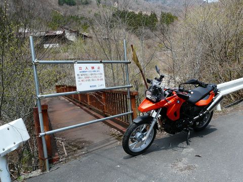普段、対岸の木の中に隠れてしまっていることの多い小倉沢小中学校跡。 って言うか、木造校舎の廃校。 やはり春が遅いため、周りの木が生えていなかった今年は例年以上に、その姿が良く見えます!(凄) ただし、入口となる橋は封鎖され! って言うか、無理に中に入ると・・・ ソコには警備会社が待ち受けているそうです!(焦) 今でも現役稼働中なのかは知りませんが、間違っても入らないほうが良いでしょう! って言うか、何度も言いますが現役鉱山の所有地内ですから、勝手に入れば不法侵入ですから!! 校庭は物置代わりに使われているようですが・・・(涙) そこには回転遊具などか残っているようで!(凄) 当時、このヤマで働いていた鉱夫の子供達が、ここで学び! そして、立派な鉱山従業者となるべく?? 育っていったのでしょう?? なお! ほぼ全体が見渡せた今年・・・ その大きさに、ちょっと驚きを覚えました!!(凄) 単なる木造校舎だけでなく・・・ 廃体育館など!(大) 思いのほか、色んな設備が揃っているみたいなんです!! たぶん?? 教材用として、トロッコ(鉱車)とかも置いてあるのではないかと・・・(涎) さすがに索道関連のものは残っていないでしょうけど!!(笑) 本当に、この秩父の山奥で・・・ その昔、一体どんな光景が展開されていたのでしょう? こればかりは冗談抜きに想像できないんですけど・・・ なお、明日・明後日は岐阜の山中にある廃スキー場跡に造られた施設に行ってます! そこで!! はあ・・・(泣) 雨か!!(泣) たぶん、3回はコケルだろうなぁ・・・(困) F650GS。 無事に帰ってこれるのだろうか???(涙) と言う事で、電波が届けば現地からのレポートです! と言う事で、鉱山道路編2010は、しばしのお休みです! で、復活後は!! ココからが本番?(謎) ついに、鉱山で使われていた索道の秘密に迫ります! もう(個人的に)萌えまくりの展開です??