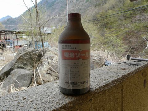 全長10km以上もの距離がある鉱山道路。 途中、トイレがあるのは八丁峠と、鉱山事務所付近の2箇所のみなんです。 以前はもっと公衆トイレが設置されていたのですが・・・ 建造物の撤去と共に消えていきました(涙)。 ま、こんな山奥のトイレ。 管理するのも大変なのでしょうし・・・(困) 特に、荒川源流の一つである川の水質管理面から言っても、色々と苦労があるのかもしれません(涙)。 で、何とか残っているトイレですが・・・ あまり使われている形跡の無いトイレですが・・・ 中には、埃をかぶって何年も放置されているような薬品の瓶が何本も放置されています! 中には・・・ 画像のように、まだ封が切られていないものまで!! って言うか! 何か危険な匂いが漂いまくりなんですけど!!!(焦) 見た感じ消毒用? って言うか、まんま消毒用。 でも何か劇薬っぽい?(怖) 絶対に原液で使ったらいけない感じ? そして、間違ってもこの手の自然浄化式のトイレには使ってはいけないような気が? しかもですよ! 疫病予防用とか書いてあるんですけど!! ココに発生する蚊やハエ・・・ その他の虫が介在する疫病(怖) それらを予防するため、その幼虫などを死滅させるために使用する薬品!! こんなところに放置してて大丈夫なのか?!(焦) さすがに怖くて誰も触った形跡はありませんけど!!(笑) って言うか、色々と違った意味で怖い公衆トイレなのでした・・・