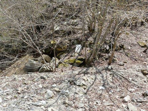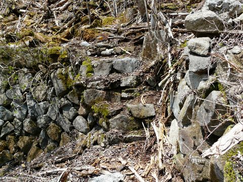 鉱山道路編2010。 さて・・・ 何やらの構造物があったであろう石垣の上に上がれる場所まで来た自分。 線路とかの出現を期待しつつ攀じ登り始めます!! 長い年月の間による風化が結構激しいですが・・・ 階段になっていた場所など、明らかに人の手の入った施設があったことを物語っています! そして謎の側溝(?)とか・・・ 大きさから言って、もしかしたら何か機械のピットなのかもしれません! そして 廃・電力計とか・・・ 色んな物が足元に転がっています!! 思わず、新たな発見を期待してしまいそうな展開!!(涎) が!(叫) 先程見た、何となく廃坑とかありそうな場所の方を見てみると!! うああ!(叫) 完全に土砂に飲まれちゃっています!(唖) しかも、放置された年月があまりに長いため、木が生えちゃっていて!! これで葉っぱが生えてたらジャングル状態??(泣) こ、これでは・・・(泣) 藪漕ぎと言うレベルの問題ではなく・・・ 掻き分けて進むのも困難? 正直、工事用のヘルメットとゴーグルでも着用していないと! そして皮手袋とか装着していないと! 確実に怪我をします! しかも・・・ 無理矢理進んでも全ては土砂の下!!(涙) ダメですね!(泣) 残念ですけど、ここでの探索は終了です。 気を取り直して次へと進みます。