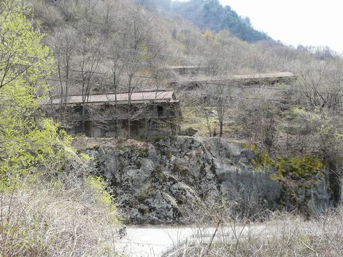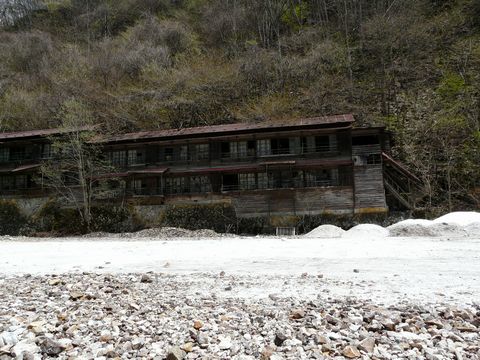 とりあえず一応の成果(索道の存在確認)を得て、鉱山道路へと戻る自分。 川を渡るついでに・・・ って言うか、すぐ先が砂防ダムになっているので、その上から川下の景色を見てみます!! 砂防ダムのすぐ先には、廃発電施設。 そう言えば自分。 この施設に立ち寄った記憶がありません! ま・・・ 通常は、鉱山で働く職員さん達の車が置いてある場所の奥にあるので、何となく行きづらいものがあるので! 何しろ、使われていないとは言え現役鉱山の施設ですからね! やはり、用も無く近くをフラフラされたら、職員さんたちも気が散るのではないかと思って!(困) ま、今回も近付く予定はありませんけど! そして、さらに奥には!! 意外と最近まで使われていた(?)鉱山の寮が見えます! 今では老朽化による倒壊の危険性があるため立入禁止となっていますけど(涙) そして、この寮がある一帯は立入禁止区域に指定されてしまっています! 廃墟系の人達が無断で入り込み!(怒) 警備面等で色々と問題もあったようです! ま・・・ ココまで外から丸見えなので、中に入る人は少なくなりましたが! たまに無断で立ち入っている人の姿も見かけます(怒) ま、殆どの人は!! バリケードが付けられている入口手前で止まって・・・ 周りの様子を見たり、外から写真を撮るだけで立ち去ります! って言うか、しっかりルールを守っています!(偉) で・・・ ふと思い出したのですが! 自分。 足掛け6年間もこの地に通っていて、この廃寮の前で画像を撮った記憶がありません! ま、鉱山で働いている人たちへの配慮から遠慮しているのもあるんですけどね! とは言え・・・ 完全に封鎖されている現在。 外から様子を見る分には問題ないでしょうから・・・ ちょっと近付いてみる事にします! と言う事で続きます!