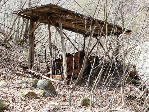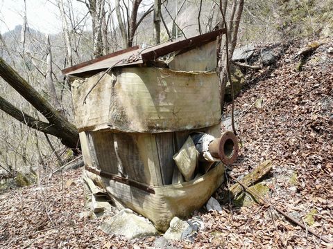 鉱山道路編2010。 さて今度は、河原の小さな林の中に何やら怪しげな建物っぽいものを見つけた自分。 やっぱし、まだ木の葉が生える前だけに色んなものが見えます!(嬉) そして当日は、鉱山道路が全線開放されて2日目(12/1~4/30小鹿野町側が冬季通行止)。 ですから、まだ誰も気付かずに通り過ぎているのではないかと思っていたのですが・・・(驚) 意外と有名な物件らしく?? 比較的新しい踏み跡が残っています! って言うか、同業者いるんだ!?(笑) 少なくとも3人くらいは、あの小屋の存在に気付いて林の中に入った形跡が! って言うか、何コレ?? どうも、この近辺に放置されている高圧ホースと関係があるのは分かりますが・・・ 中継所? それとも、中間のポンプ小屋?? フランジが左右に2箇所出てますからね! しかも高さが違っている? と言う事は、やはりこの中で高圧ホースで運んできたものを中継しているのは確実!! そして・・・ このムシロに包まれた構造は一体??(謎) たぶん凍結防止だと思うんですけどね? 鉄板の屋根も角度か付いていて、雪が積もらないようになっているみたいですし・・・ 冬場は物凄くなるはずの、この場所。 運んでいたのは「水」なのか? 飲料用の水なら、近くの沢から確保できるので・・・ しかも鉄鉱石とか採掘しているわけではないので鉱毒の心配もありませんからね! この上流の珪砂工場に水を運んでいたのとは違うようです。 おそらく・・・ 水だとすると、坑道内から出た水を下流にある水処理システムに搬送するためのもの?? そして・・・ 全盛期には、この手の建造物が何個も建てられていて、中継・分岐・合流を繰り返していたのではないかと?? ただ、見つけれたのは、この1個だけでしたけどね!(悔) 謎だけが、またも残ってしまいましたが・・・ やはり1000人以上もの人達が住んでいたと言われる、この山の中。 まだまだ、色んなモノが残っているようです!(探)