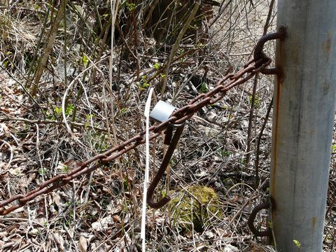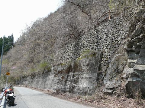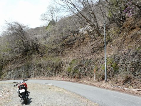 鉱山道路近辺・・・ やはり、草木が生える前だと想像以上に色々な物が見えてきます!(凄) 画像の斜面だって・・・ よくよく見れば石垣が!! フェンス代わりに鉄製のパイプを立て。 そこに鎖かワイヤーを立てていたような形跡も残っています! 建物があったにしては狭すぎ? そして通路にしては路盤の造りが丈夫過ぎ?? 何となく坑道に続く線路があったっぽい感じがするんですけど!!(萌) もしかしたら、今の道になる前の旧道の路盤なのかもしれませんけどね! でも今は、上から落ちてきた土砂で埋まっていて(涙) 平らな部分が無くなって、殆ど斜面と化している感じです!(悔) リスクを背負って登っても、それに見合うだけの発見がなさそうなので確認しに行ききませんけど!! そして・・・ 恐らく以前は、鉱選所とホッパーがあったと思われる遺構・・・ 他所様の情報によれば、この上に線路が残っているとの事なのですが!(激) 一昨年、自分は途中まで登って・・・ いきなりの落石に遭い!(叫) 危険を感じて撤退した記憶があります! そして今年は! ここまで木が生えていない時期ですからね! 落石にビビッてる場合じゃないですからね!!(熱) 思わず再アタックを敢行したいという欲望が!!(熱) が、です!!(泣) このすぐ脇には、地元ナンバーの4輪駆動車が!!(焦) 今まで何度か見かけたことのある4輪駆動車が!!(困) おそらく、鉱山関係者の方の車だと思われる4輪駆動車が!!(泣) くっ!(噛) 悔しいけど、むりして登った先で遭遇したりしてしまったら!!(逃) 怒られるのは確実!!(涙) でも、出会わずに済むかもしれない?? けど、降りてきたところで出合ったりする危険性も! そして・・・ オレンジ色のF650GSは目立ちすぎる!(困) こんなところに停めておいたら、山の中に入っていると確実にバレちゃう!!(泣) はあ・・・(悔) この鎖で塞がれた道の先に線路(パラダイス?)が待っているのと言うのに・・・ つづく?
