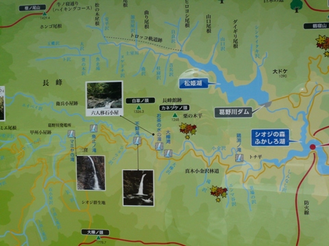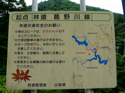 葛野川ダムを目指せ2010編。 とりあえずです! 松姫湖奥地にある林鉄跡は気になりますが!! って言うか最近、線路に飢えてる??(笑) 良く考えれば今年は、まだこの手の線路と直接出会っていないですから!! 帰ってきて、画像を確認したら写ってたとか! そんなのは確かにありましたけど!! 日原の時も、崖下に降りなかったから間近で見てないし!!(悔) とにかくです! 線路の事は気になりますが!! まず手始めにです! って言うか、行く途中に通過しますから! 葛野川ダム正面攻略における絶対条件となる・・・ 林道・葛野川線の調査に向かいます!! 完全に舗装が終わってしまっていることが確定している林道ですが・・・ この道に入らないと葛野川ダムの正面に向かいことが出来ません!!(悔) 画像の地図に赤線で書かれている区間なのですが・・・ うわ! またかよ!!(泣崩) って言うか、サービス悪すぎだぞ山梨県!!(訴涙) そりゃあ、山の中を荒されたくはないでしょうけど!! ダムを正面から攻略したい気持ちを踏みにじるなんて!!(滝涙) 通行するときは20km/h以下でお願いしますとか書いてあるのに!!(訴) 通行させてくれる様子なんて微塵のかけらもないやんか!! くうぅ! いつかは徒歩で入ってやる!! ゲートは閉まってても、立入禁止って書いていないから入っても問題ないんですよね!!(怒訴) でもとりあえずは、です・・・ 天気も段々怪しくなってきたことですから、今回はパスと言う事で・・・(悔)