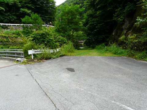 さて、上の画像は・・・ これから入ろうとする林道・土室川線の案内図。 赤線で書かれている部分が、それに当たるのですが・・・ おそらく、点線になってしまっている部分は、車の通れない登山道と言う事になるのかと。 とは言え! 小金沢公園で見た案内図と比べると・・・ 何となく! って言うか、これが事実なら!!(熱) 線路が残っているかもしれない区間と、車道区間が重複している!!(涎) ま・・・ この区間のレールは撤去されてしまっているかもしれませんが!!(焦) 恐らく今では、線路の路盤跡を利用した整備林道に変わり果てているかもしれませんが!!(困) それでも、その奥になら! まだ残っている可能性はあります!! と言う事で・・・ あとは、この先に見えているトンネルの中間付近にあるゲートが閉まっていない事を祈るだけ!! もう(当時は)7月に入っていますからね! 解放していてもおかしくないはず! とは言え・・・ 先の2件の事がありますからね!!(怪) とにかくです! 恐る恐るですが、先に進むことにします! が! その前に、ちょっとだけ引っ張りますよ・・・(笑) って、いつもの悪い癖が出ますけどね!!(笑) 今立っている場所。 実は、ココ・・・ 意外な場所だったりするんです!!(驚) 道路の継ぎ足しの跡がありますが・・・ その線の左側は・・・ 実は!(驚) 単なる展望台かと思っていたんですけどね・・・ 今朝の画像なんかも、この上から撮っていたりするんですけどね! でも、ココは・・・ 展望橋と言う橋になっているんです! 橋と言っても・・・ 片側が完全に陸地にくっ付いていて・・・ 単なる張り出し部分? って言うかベランダ状態?? って言うか、どう見たって展望台やんか!!(訴) な、状態なんですけどね!!(困) で・・・ 物凄く疑問なので、辺りを色々と探索してしまいました! と言うのも・・・ 画像の赤斜線部分の様に・・・ 元々は、そこに橋が架かっていたのではないかと思ったのですが! ま、この辺り地質から言って、崩落が起きやすい場所ですからね!(焦) 橋の1本や2本。 台風の時に落ちちゃっていても何の不思議もないですから!(怖) ですが、まわりの状態を見ても、そんな気配はない! そして今後、ここに橋を架ける気配もない! って言うか、ココを整備すれば林道・土室川線へのアプローチが楽になるのに! と同時に、葛野川ダムの詰める東京電力の人たちにとっても有益なはずなのに!! 何となく不思議な地形です・・・ って、あまり深く考えると、この先のゲートの事が心配になってきてしまうので・・・(困) とりあえず、少しだけ前進です!!