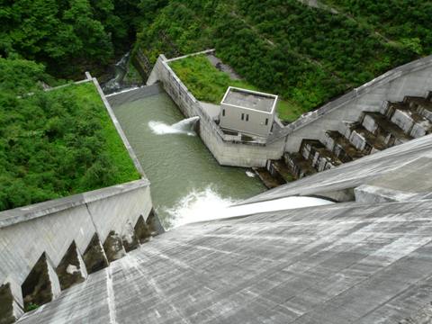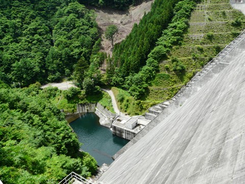 深緑の深城ダム編。 って、ついにタイトルが緑色になったぞ!!(笑) でも内容は変わりませんけどね!! さて・・・ 真上から放水シーンを見ようと、ダム堤の上を進んだ自分。 が!!(硬) 思い出してみれば・・・ って言うか「放水」の2文字に踊らされていなければ?? もっと冷静に考えてみれば?? そう・・・ 深城ダムの中央には、排水ゲートの水門を操作する塔が設置されており!(困) 中央部の真上に立つことが出来なかったんですよね!!(悔) と言う事を・・・ 歩き始めて、30mくらい進んでから気付きました(呆) 仕方ないです!!(涙) とりあえず斜め上方から! とは言え・・・ 放水量が少ないので、イマイチ迫力が!!(泣) そして、ついでに?? 反対側(って言うか、塔の向こう側)からも! でも、何かこう・・・ 物足りないと言うか!!(悔) と言う事で、何か別角度から見る手立ては無いかと辺りを見回す自分。 目つきの悪さに、ダム管理事務所から警戒されていなければいいんですけど・・・(笑) とりあえずです!! この右岸にある擁護壁の段。 これに乗れると、結構面白そうなんですけどね!!(涎) とは言え、こんな所に乗って見つかったら確実に怒られるだろうなぁ・・・(困) でもです! フェンスとか、バリケードとかついていなかったら!!(期待) つい勢いで入っちゃって!(良い子は真似しちゃダメだぞ!) なんて事が出来・・・ いやいやいやいや! そんな事は絶対にダメだ・・・ たぶん・・・ でも現実は!! ちっ!!(悔) しっかりとフェンスが付いてて・・・ 隙間とかないし!!(泣) やっぱし入ることはできないのね??(涙) って言うか、入っちゃダメですよ!!