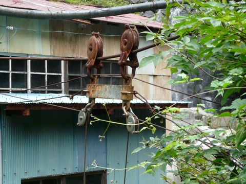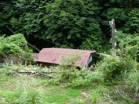 何か、当初の予定とは違って意外と引っ張っちゃってる・・・(困) 夏の鉱山道路編2010。 さて、小さな沢を渡る索道を発見! そして橋の落ちてしまっている対岸には謎の建物。 ちなみに自分は、鉱山住宅に電気を供給している発電所だと信じ切っていました! が、です! 何か、どうも様子が違うみたい?? と言うのも・・・ 索道のウインチワイヤーの先に繋がっているのは!! コレはどうみても取水ポンプ!! いや、発電所のボイラーの水を供給するものなのかもしれませんが・・・ 何か様子が違う?? その水でお湯を沸かしてタービンを回しているのかもしれませんが・・・ どう考えたって効率が悪すぎる!! って言うか! 建物からニョキニョキと出ているパイプ・・・ そかも、付近一帯の斜面などには導水管らしきモノが這い回っている!!(蔓) って言うかココは! 元々は鉱山住宅や施設に水を供給するための施設? でも? あんなポンプで汲み上げてる水だけで足りるのか? 何しろ、最盛期には1000人以上もいたというのに!! ま、当日は別の取水施設があったのかもしれませんが!! 何にせよです! あの索道は取水ポンプを上下させるためのモノらしい(川の増水などに対応して位置を変えるため?) そして・・・ たぶん、ココで採取した水を鉱山内に供給していたらしい?? ま、この辺りも後々、調査していくことにしましょう・・・