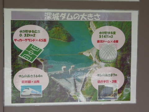 深緑の深城ダム編。 深瀬ダムの管理事務所前に貼ってあった、ダムに関する資料。 ま・・・ お約束の、大きさ比較の資料ですけど。 でも・・・ コレ、マジで微妙すぎる!!(笑) 水が貯まる広さ。 サッカーグランド、45面分 うわ! 何か物凄く想像しづらい比較対象なんですけど!(困) と思えば・・・ 水が貯まる量。 東京ドーム、4杯分。 いや! せめて、統一しようよ!(願) 面積比較がサッカー場で、体積が野球場って!! 更に分かりづらくなるし!!(困) そして・・・ ダムの幅。 新幹線、6輌分。 って言うか、最近あまり見かけなくなったよね? この形・・・ 「のぞみ」がデビューした当時は、物凄く衝撃的(それよりも乗った時の快適性が素晴らしかった?)ですけど。 今ではJR東海は「カモノハシ」だらけですしね!! そして極めつけは!! ダムの高さ。 山梨県庁ビル、3つ分。 ご、ゴメン!!(謝) マイナーすぎて全然分かりません!!(涙) 自分、山梨県民じゃないし!! 何にせよです! この手の比較ネタ。 色んな比較対象があって、面白いから好きです! が・・・ ココのは、ちょっと難しすぎるぞ!!(泣)