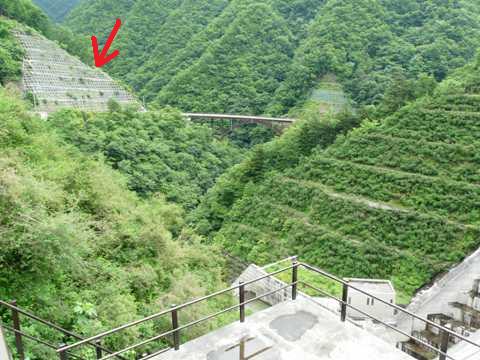 さて今度は、深城ダム・ダム堤の上を歩いて対岸に向かいます! もちろん、放水シーンを真上から見るために!!(涎) ただし! 歩いている途中で、ふと気が付いたのですが・・・ ダム堤上から見える、ダム正面の光景。 そう。 思い出せば去年。 ダム正面攻略時に・・・ って言うか、深城ダムの場合。 何の苦労もなく、正面(国道139号線)から見ることが出来るんですけどね! でも、もっと見やすい場所を探して攀じ登った防護壁。 ちょうど、画像の赤矢印付近なんですけど! 望遠で見てみると・・・ 確かに(崩れてたけど)階段の手摺が見えていますが・・・ あそこから先は、さすがに身の危険を感じて登りませんでしたけど!(怖) って言うか、それ以上登と、今度は逆に周りの木が邪魔になって視界が遮られる可能性も高かったですしね! 何にせよです。 自分。 今考えてみれば・・・ かなり無謀なことをしていたような気が!! って言うか!!(訴) 良い子の皆さんは絶対に真似しちゃダメだぞ!! ま、その見返りに、結構ダイナミクスな光景が見れますけどね! 18mm以下の超広角レンズとかあったら、結構面白い画が撮れそうなんですけどねココ!