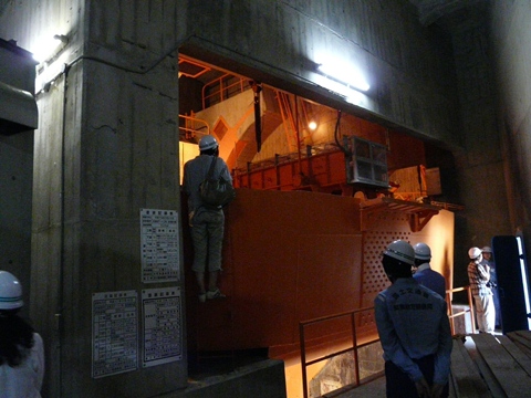 さて・・・ 皆さんが1人ずつ外に出て見学をしている間は! 内部では、このオレンジ色の物体の見学で盛り上がっています! 各自変わり番コに梯子に登り中を覗き込んだりして・・・ で? 何が見えるかと言えば!! このライトアップの色が良いですよね!!(萌) そして何とも言えないメカメカしさ! じゃなくて機械っぽさ!(涎) 機能美ではなく! 機械としての美しさ?? 後日。 別角度から見た画像と共に、改めて紹介しますが! コレが常用洪水吐き。 通常の放水を行うためのゲートです!! この下の方からドバドバと出ているゲートの蓋と、それを動かすための機械です!! それをダム内部から見ているんです! そして何より、4年前に改めて塗りなおされたため、物凄くキレイな状態になっています!!(肌) ただし、放水しているときは!!(叫) 間違っても、こんな場所に立っていられないかと!!(滝濡)
