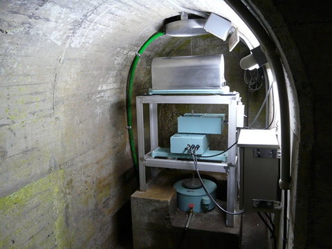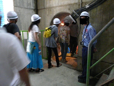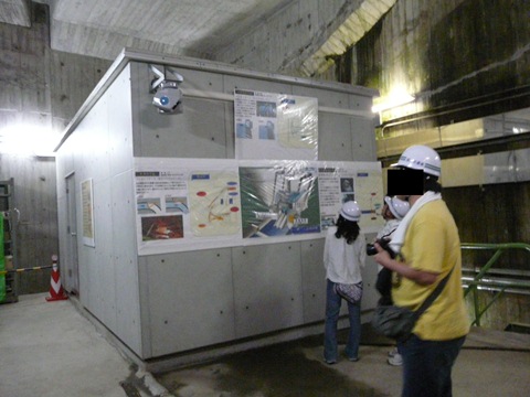 二瀬ダム・みてんべぇツアー2010編。 さて今度は、一旦内部の階段を下ってダム提の中心部に向かいます! とは言え・・・ 今から半世紀前の設計ですからね! 当時の日本人の平均身長を考えると・・・(狭) 身長172cmの自分でも、ヘルメットを着用すると!!(当) あちこちで頭をぶつけてしまうほど窮屈なんです!! そんな階段を身長に降りて行き・・・ 今度はエレベーターで一気に下のほうに降ります! が! スケジュール関係上。 あまりゆっくりしていられないので!(涙) 画像を撮っている暇なんで全く無く!!(悔) また、あまりに狭いので! 引きを取る余裕も無いので、マトモな画像なんて撮れるわけも無く!(涙) エレベーター付近の画像は一切ありません! ただし! 自分。 ただではコケません!(誓) 来年。 再び、ツアーに参加する際に! どのタイミングで画像を撮るかを、しっかりと頭に叩き込み! そして色々と計算をしています!! って言うか、来年も絶対に行くぞ!! ま、そんな事はさて置き・・・ エレベーターを降りると、今度は狭い通路を進みます! 外は気温が30℃近いですが・・・ 実にヒンヤリとしていて!(涼) って言うか、ちょっと寒いくらい? ただし湿気が多いので、歩いていると結構汗ばんだりしますけど! そんに通路を・・・ 動かないサソリとか? シッポから降って来る蛇の攻撃とか?(笑) そう言ったもに遭遇することなく・・・ かなり大きな広間に出ます!(驚) 照明設備もしっかりしていて、結構明るい!(凄) こんな場所がダムの中にあるとは想像もしていなかったので、ちょっと驚きの自分!! そんな中・・・ 冷静になって辺りを見回すと・・・ 同業者が、いっぱい!!(爆) って言うか、夏休みと言うのに子供連れで見学に来ている人とかいない事に、今更気付いたんですけど!!(唖) 小河内ダム50周年時の見学会の時は、半分くらいはその手の社会見学的な人も多かったのに! この二瀬ダムは・・・ 明らかにマニアの人が多い!!(笑) って言うか、自分も他人の事はいえない!!(焦) そんな状態で地下秘密基地・・・ じゃなくて、内部の見学は続きます!!