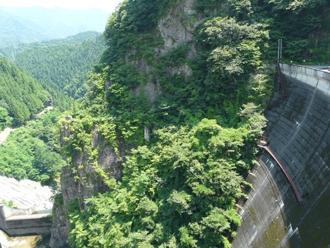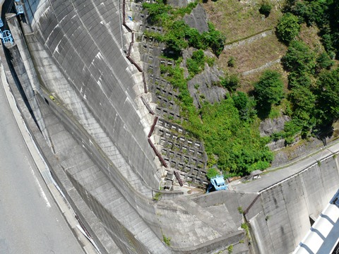 二瀬ダム・みてんべぇツアー2010編。 下の階層からは! 一旦外に出て、ダム中腹から景色を眺める事ができます! が! 狭い上・・・ 足場の劣化が激しく・・・ って言うか、ドアの縁とか錆びて(って言うか腐食して)ボロボロだし!(焦) その先も、苔が生えまくっていたりして!!(滑) ちょっと危険な状態になっているので、一人ずつ順番に外に出ることになりました! ですから・・・ 一人の持ち時間は1分程度(涙)。 その間に、色々と画像を撮らないといけないのですが・・・ いやぁ!(焦) いざ自分の順番になってみたら!! もう舞い上がっちゃって、焦りまくっちゃって!(恥) せっかくのチャンスなのに、マトモな画像を撮ってません!!(哀) とりあえず、振り返って上の方を見てみました! が!(泣) 背後の壁が邪魔して何も見えません!(泣) って言うか、画像的に期待していた物が取れなかったのでパス!!(悔) そして左側! にしても・・・ 管理事務所移転用の、あの橋。 物凄い架け方してますね!(唖) 無理矢理谷の斜面に沿って橋脚を打ち込んでるし! って言うか、普通に斜面を削ったほうが早かったのでは?? で、最後に・・・ って言うか、後の人のことを考えて「早しなくちゃ」と言うプレッシャーから!焦り とりあえず今回は、来年への布石だね!(凹) とりあえず一旦、中に戻ります・・・