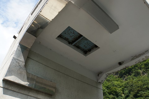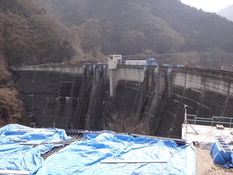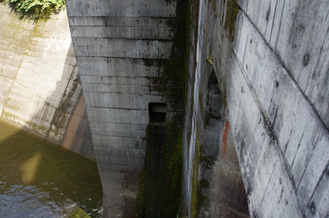 みてんべえツアー2013編。 右岸方向! 目の前に見えているのは・・・ ハウエルパンガーバルブが隠されている区画! 目の前のスリットから、オーバーフローした水が吐き出されます! で・・・ 目線を、ずっと前の方に持って行くと・・・ 希少な植物が生息していると言われる巨大な岩盤!! アソコにね・・・ 穴があるんですよね(涎) 恐らく、二瀬ダムを建造するときに使われたと思う? たぶん石を切り出した? 坑道のズリ石捨て用の穴? または換気用の穴? にしても! 物凄く気になる穴があるんですよ! ですが!(悔) こと角度からは・・・ なんの手がかりも見つけられませんでした(涙) そして次に! 左岸に目を移します!! 発電所への道。 悔しい事に、関係者以外立入禁止です! そして!(唖) ダム管理の人間ですら・・・ 管轄外ですから許可なく入る事は出来ません! う~ん・・・(困) あの場所に入る事が出来たらなぁ! 来年は東京発電さんの許可を貰って、左岸にも入れるようにしようよ! って、良く考えたら・・・(困) 浦山ダムと同じ日に見学会を開いたら。 向こうに東京発電のスタッフが行っちゃうから! しかも休日出勤させられて行かされちゃうから!! 二瀬ダムまでは出向いてくれないのが! だから・・・ 別の日程でね? って、ソレはソレで2周連続とか。 自分としてはスケジュール的に辛くなるから困るんですけどね? で! 左岸の上を見上げれば!!(叫) 秩父湖大橋聳え立つ!!(凄) にしても・・・(唖) あの橋脚の多さ! ムカデなんてレベルじゃないぞ?(笑) にしても・・・ もう少し、簡素化して道路が造れなかったのか? 物凄く疑問だぞ??(困) そして・・・ 二瀬ダム・堤体との接合部 もうソコに、旧・管理事務所は存在しない!(涙) なんか・・・ 下から見ると、あまりにあっさりしてるな?? ちなみに! 在りし日の頃の旧管理事務所 こうやって見ると・・・ 雰囲気が全然違いますよね? そして・・・ 本当にスゴイ造り方をしていたんですね? あれじゃあ確かに(焦) 耐震基準をクリアできないよね? 完全にオフセットして、堤体の上に張り出してますしね!(驚) まあ、今回は! 思ったより充実した、展望を見る余裕があったかな? とは言え・・・ 帰ってきてから、なんで「あの角度」を撮らなかったのか? と悔しがった方向とかがイッパイあったのは内緒ですが・・・