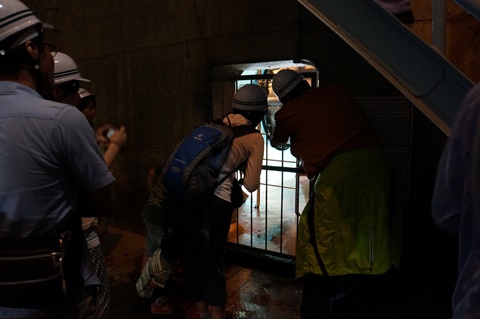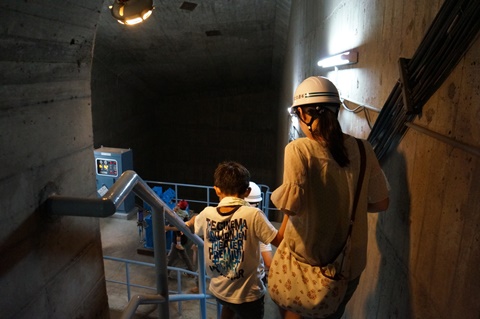 見上げればツバメの巣 って、今日も激しい引っ張りの予感が漂う(困) そんな画像からスタートする・・・ みてんべえツアー2013編 と言いつつも? やっと中に入る? そう! この業務用扉の奥にあるエレベーターに乗って! ちなみに普段は鍵がかかっているので、中に入る事は出来ません! しかも! ドアを開けると自動的に警報が鳴るシステムになっていますから!! こっそり侵入しようなんて絶対にしないようにしてくださいね! って言うか、不法侵入は犯罪ですから!! 意外に狭い内部 確か13人乗りと書いてあったような気がしますが・・・ 昭和36年竣工の二瀬ダム。 当時の日本人の標準的体格を基本に計算されていますから!(焦) 現代の日本人の体格に換算すると・・・ まあ、9人乗ったら(詰) かなり窮屈!!(泣) で! 降りた地下は!! ああ、なんか今年もココに還ってきたと言うか? 妙に狭さと・・・ そして外気温30℃に対して、13℃くらいしか無い地下通路! 急激な温度差に! 涼しいを通り越して! 寒いと感じてしまうほど! そして眼鏡をかけている人は・・・ 一瞬で曇ってしまう事もあります!! で・・・ そんな中!(蠢) 相変わらず、プニプニ・フニャフニャしている謎の生命体が壁一面に!!(滑) ちなみに触っても実害はないそうです! でも・・・ なんか妙に生温かくて。 かなり不気味だぞ!! 更に!! 天井にも、ビッシリと!!(叫) なんか張り付いてるし!! って苔の一種ですが・・・ 結構、見学者の皆さん・・・ これに気付かずに、普通にスタスタ歩いて行っちゃうんですよね!(唖) 後で職員さんに言われて、初めて気が付いてびっくりしている人も多かったりして! まあ・・・ 突然のように涼しくなるから、ホッとする気持ちで一杯になり! 周りを見ていないのかもしれませんね? で・・・ で! いつもの、ダムに関する説明会開始! 小学生のチビッ子たちは、夏休みの宿題(自由研究)のために色々と質問してみたりして! って言うか、偉いぞ! そのご両親!! やっぱし小さい頃からダムの英才教育をしておかないとね!(笑) で、次回・・・ え゛? もしかして、いきなりメインディッシュに行っちゃうの?にほんブログ村