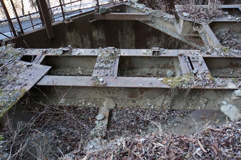 大血川鉱山跡2014編・ファイナル! 地下坑道へと繋がっていたらしい線路の跡!(萌) そして、このガーターが良い味出している??(涎) でも、この構造だと! たった1輌ののグランビー鉱車を手押しで動かしていたのか? 後ろからバテロコなんかで押していたとは思えないのですが!! かと言って、曳鉄線だったと言う可能性も低そうです? 一体、どうやってトロッコを動かしていたのでしょう?(謎) って、いきなし引っ張ってますが!(困) この辺にしておかないと! 通り掛りの人に見つかって通報されても困りますしね!(焦) 既に埋め戻されてしまった坑道!(涙) しかも、キッチリとコンクリートで固められてしまっている!!(悔) 現役時代は、ここから2本の線路が出ていたんですよね? で! 採掘した鉱石を運んできていたはず! そして・・・ 閉山後も、地下坑道からは水が止まらずに出てきてしまっている! だから! それを逃がす穴を開けておかないといけない! そして・・・ もしかしたら、コレが秩父源流水と同じ水脈から出ているモノ?? なのか??(謎) まあ! 石灰の採掘をしていたのなら、鉱毒とか全く問題ないしね! 水処理の問題も無いから! そのまま放水していても、環境には全く問題ありません! 逆に天然のミネラルを大量に含んでたりしますからね!! で! ああ(涙) 駄目だったか? って言うか! 地下水って、基本的に冬は暖かいんですよね? 地熱で温められていて! 放水量が少なくて! そこへ風か吹きつけたりすると凍結するけど!(特に日陰は) でも! 凍ってない!(悔) そして見事なまでに放水している? で! 一番左の穴にホースが!! って! やっぱし、ココから出る水を・・・ ホースで、この水汲み場まで引っ張ってきていたらしい? その長い距離の間で、水温が下がり!(寒) で! 放水口付近で凍結しちゃってたのね? う~ん・・・(悔) この3本の穴かから、真っ白に氷柱が出ているのを期待していたのに!!(涙) やっぱし駄目だったか? でも! ハアハア・・・ 振り返って見た、廃線跡最高!(悶) と、コレが見れたから良いか! と・・・ その場を後にしたのでした!にほんブログ村