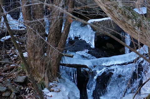 枯葉の上に飛び出した三角形の石の上に流れた水が凍結して・・・ また、コレが面白い形になっています!(和) ただし、こんな細かい所をイチイチ見学して行く人は少ないよね? って言うか自分。 昔から・・・ 全体のバランスよりも! 一部分の細かい場所のみに気を取らることが多くて? 機械の改造なんかも! 大がかりなモノよりも! 細かい部分的な・・・ やっつけ仕事っぽいのが一番得意としてたりします!!(笑) と言う話は置いといて!! ちょっと坂道を登ったところから氷柱の方を振り返って見たりして! 意外と高さがあるんですよね! ココ! って言うか(焦) この坂道。 本当に立っているだけでも、結構辛かったりするんですけど! ここで、10分間立っているだけで! 脚のストレッチ運動になってしまうのではないかと?(笑) そんな場所なんですけどね! だからか? つい勢いで下り切って! この氷柱を見ずに通り過ぎ! そして登る時は! あまりの急こう配に、思わず下をうつむいて歩いてしまうから!(苦) だから、殆どの人がスルーしてしまうのか?(困) そんな気もして来たりして??(焦) これで雪が乗れば樹氷の完成だね? そうすれば、もう少し? 見向きされるようになるのかな? とは言え! 槌打キャンプの氷柱 実は、コレが本命ではありません! 真の姿とは? そう! この急坂を登りきったところに待っているんです!! つづく。にほんブログ村