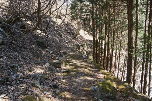 林鉄入川線路盤跡2017編 良い感じの道幅が続きます! 間違いなく! ココを林鉄が走っていた! と思うのですが・・・ ジャストサイズな路盤ですしね? ただし! 二瀬ダムが完成した後。 廃止されて・・・ 線路が撤去され! 一部区間を林道として利用していたはず。 その時に嵩上されたり。 あるいは別ルートに変更された区間もあるかもしれない? もう既に半世紀以上も前の話ですから・・・ って、あ!(叫) ヤバイ!(焦) 石垣が2段になってる!! 単なる法面補強のためだったら良いけど・・・ あるいは! 木橋だった区間に土盛りして、林道化したのかもしれない? この付近は、何度か修正が加わっている可能性が高いぞ!(困) しかも! コンクリートの打ち方とか! 後から補強した感じが漂っていますしね?(悔) 更に! この付近は、ちょっと雨が降ると沢になってしまうんだろうな?(困) と言う事で? 改質工事も行った跡がある! もしかしたら! この付近は・・・ 元々は木橋が掛かっていた可能性が高いよね? って事は・・・ 今歩いているのは! 一応。 林鉄入川線が通っていたルートだけど! 本来の路盤ではない可能性も高い? ちょっと疑いの目で見始めてきた自分。 何にせよ! 上を見上げで見ると! やっぱし・・・ ココ。 雨が降ると沢になるんだな?(困) 一筋、木の生えていない部分がありますからね! 再調査とか来るときは、天気にだけは気を付けておこう!!(焦) また何かの資料が手に入ったら、確実にココに来るはずですから! なお・・・ 昭和22年発行の国土地理院地図には・・・ 判読しづらいのですが!(悔) 確かに林鉄らしき表記が載っているんです! と言っても! 当時の事ですから(困) なんと! 昭和4年に調査した事を、18年も経って発行してたりするので(焦) どんだけ正しい物なのかは不明です。 それに・・・ 現在ほどの測量技術もない当時。 正確に、どの辺りを通っていたのか? あてにならないところもあるんですけどね! だけど! 間違いなく、ココを通っていはず!! ちなみに当時。 国道140号線は存在しません! だって戦前だし・・・ とりあえず、人道として・・・ 現在の国道140号線の付近に点線表記がされています。 それを使って、川又の集落に入ったようです。 でも不思議な事に!(焦) 大正2年発行の地図には! その人道表記部分に道路表記(と言っても明治期の道路だから、荷車が通れるサイズの道の事だろうと思う)が描かれているんですよね・・・ まだ林鉄は存在してなかったりしますが!(焦) 結構、謎な部分が多いんですよ。 この付近・・・ つづく。にほんブログ村