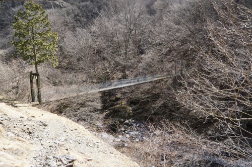 キちゃったよ! あの吊り橋・・・ とりあえず今シーズンは、大した雪が降らなかったので! 重さで崩落したとか!(泣) そういう事態には陥らなかったらしい? まあ、それよりも・・・(焦) この吊り橋 一体、何のために架かってるのか? 未だに、その謎は解けていません(困) 登山道からも外れている。 営林署の人が使うにしても・・・ あるいは、東大の演習林関連の人たちが使用していた物なのか? それも違うッポイ? もし、そうなら。 営林署の名前が書かれた看板が立っているか? 東大の演習林だから、一般の人は入らないで! みたいな事が書かれているはず・・・ もしかして?(滝汗) 吊り橋マニアが架けたマイ吊り橋 と言うのは冗談です! この路盤。 元々は林鉄の物! それを林道化して・・・ おそらく、現在の国道140号線が開通する前にも「暫定酷道」として一時的に使っていたかもしれない? 何にせよ! 登山道国道(しかもトイレの真ん中を突っ切るという) 人道国道として、平成10年まで長きに渡って君臨していた国道140号線ですから!(笑) 何があってもおかしくない! 間違っても自動車が通れないサイズの道幅ですが!(焦) コレが国道だった可能性も捨てきれない?(笑) そんな道なので? 怪しい吊り橋の一つや二つ。 あったとしても?? 特に問題がないかもしれない? とにかく! この辺りの疑問は。 もっと時間を掛けないと、答えは出てきそうにありませんが? で!(ハアハア) 親柱は、まだしっかりしているんですけどね!! 錆が浮いているけど・・・ 腐食している気配はない! だから・・・ 人が乗っても倒壊する危険性はない! って言うか、谷筋に吹く風にも耐えているのですから。 そう簡単には倒れたりしません! なのですが! 橋板の! このウネウネ感がマジでヤヴァイ!!(怖) しかも!(怖) 板が外れちゃっているところもありますし!(泣) 個人的な作戦としては! そう! この端渡ろうぜ? って言うか、真ん中は危険すぎるから両端を大股開きで進もうと! そう考えていた。 ですが・・・ 今、改めて橋の状況を見たら! 想像していた以上に危険すぎる!!(怯) 端っこの部分も、木の板が腐食して(壊) 釘が抜けていて、フラフラしている・・・ って言うか、橋板。 乗っかっているだけで固定されてないッポイ? 強く踏めば! バラバラと落ちちゃう危険性が! ついでに自分も谷底に落ちちゃうZO!! 恐る恐る・・・ 片足を乗せてみました。 カタッ 橋板。 浮いてるね? うん! 釘とか、残っているけど・・・ 木が腐食してて、引っかかっていない! って言うか、固定されていない! グラグラ動く(泣) で・・・ 簡単に外れる! て! 歩いているうちに、何枚か川に落とす危険性が高すぎる! ついでに自分も一緒に落ちるかもしれない!(泣崩) 良い真似モード封印!!(叫) って言うか、無理!(泣) コレはあまりに危険すぎる!(怖) この吊り橋の渡橋は断念します! って言うか、リベンジできませんでした!! コレを人は・・・ 完全敗北と言うorz そこで! ハアハア 困ったな? 時間。 一体どれくらいかかるかな?(困) だけど、呼んでるしね? 林鉄跡が!!(叫) 現・酷道140号線の崖下。 完全に死角に入ってて、殆ど気付く人がいない(涙) この路盤。 もしかしたら、林道化した時に嵩上げとかされちゃっているのかもしれないけど(困) この道を進む・・・ 林鉄入川線跡2017編。 改めてスタートです!にほんブログ村