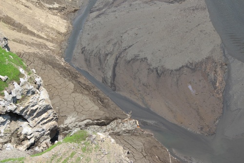 土砂に埋もれかけた桟橋の見える位置から、後ろを振り返ってみました!! 旧・県道210号線跡 こちらは・・・ 結構ガッツリと法面補強がされています。 って! この落石防護対策。 県道時代から、元々あった物なのか? ダムの建設が始まってから補強された物なのか? 時代的に、ちょっと微妙っぽいな? 特に!! この補強の仕方が・・・ 一時的対策と言うか? 突貫工事で壁を造ったポイ? 湖底に沈める事を前提に・・・(涙) 斜面が押されて崩れないように壁を造ったみたいな? そして・・・ アンカーを打っていることから! 水を張った後の、ひび割れ防止対策をしているようにも見えますしね? ココから先、少しだけ右岸道路を上流に進むと!! うわ! なんかスゴイの見えてる!!(って、またかよ?) そう・・・ 旧・県道210号線から右岸道路まで上がるための仮設道路! このオメガループ状の人工路盤! 凄いな!(唖) よく地方にある、山間部の急斜面にある畑の中の道路みたいだぞ! はっきし言って! 非力な車で、途中で泊まったら最後!(涙眼) 再発進が困難な坂道みたいな?(笑) あんな農道を思い出しちゃうぞ!! じゃなくて! 見えてるでしょ! もっとすごい物が!!(涙訴) 橋だよね? でも・・・(焦) 何となく仮設ッポイ造りだな? だけど! 親柱が残っていると言う事は!(叫) 橋の名盤が設置されていた可能性が高い!! 正規の県道に架かる橋(だけど緊急補修の状態で使ってました)の可能性が高い! あと 奥の方に石垣が見えてます! 沢の両岸に石垣が造られていたとしたら・・・ 元々は、人家があったのかもしれない? って言うか、あの橋の付近が塩沢集落跡と言う事になるのか?? 流れ込んだ土砂によって姿形が全く変わり果ててしまっていますが・・・(涙) そして! 家が建っていた基礎部分とか、すべて埋まってしまっているのではないかと?(悔) 更に! 手前にも小さな沢が見えいるぞ!! いや? こちらは・・・ 元々は道路下の土管を通るように改良されていたけど? ダム湖に沈むことによって、その土管の入口が土砂部塞がり(詰) 再び、沢となって溢れ出し! 道路跡の上を流れていると言った方が? もしかしたら!(焦) 以前は、この土管の部分(コンクリートで固められている付近)に小さな橋が架かっていたのではないかと? まあ、それにしても・・・ この付近の土砂の流入堆積率! ちょっと半端ないな?(埋) 路盤が、ほぼ埋まっちゃってるし! って言うか、県道が現役時代も・・・(焦) 結構、頻繁に沢が溢れたのではないかと? って・・・ 本当に、この付近に集落があったのか? 自分、間違った見解をしているのではないかと? ちょっと疑問を抱きつつ! 今度は・・・ あの橋が正面から見える場所がないか? そして、もしかしたら!! 親柱に名盤が残っていないか?(たぶん退去するときに撤去されていると思うけど) それを確認できる位置を探して。 右岸道路を先に進みます。 つづくにほんブログ村