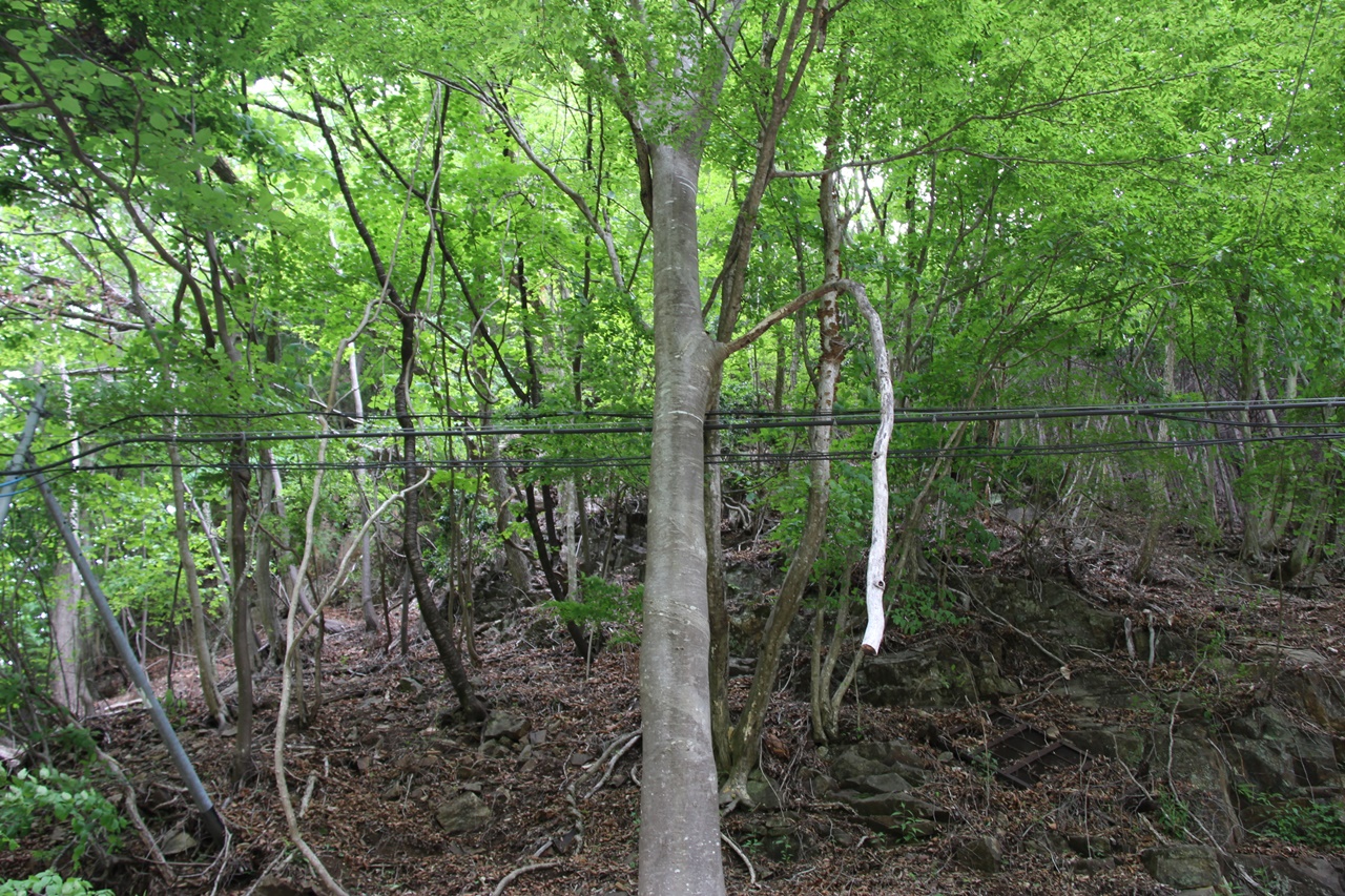 鉱山道路2019編 実は、この付近の地形・・・ 古い資料なんかを見ていると! 大黒坑が現役で稼働していた時代 ズリ石(捨て石)が大量に積まれていて! って言うか・・・ 沢が、殆ど埋まってしまうのではないかと言う程(焦) 両岸にズリ石が積まれていて・・・ 現在の地形と全く違うため 位置関係を掴むのが大変なんですよ! で・・・ 第一警備の前にある、この石垣 雁掛トンネルが開通する前後の写真には写っていません! しかも! 警備小屋が、この壁の位置にある 川の方は、まだ擁壁工事が終わっていなくて 土砂が剥き出しの斜面だったりする ので! 時代的に色々と変化があり過ぎ 判らないことだらけだぞ!(悔) とりあえず? トラックやダンプが大量に出入りするようになり? 待避所・兼・交差できる場所として確保するため 警備室を川側に移したと? で! 看板小さすぎて見えないけど?(笑) 斜面を切り崩した場所に、崩落防止用に石垣を造った! と・・・ そう考えるのが妥当な所か? で! この場所から見上げる・・・ 中津抗跡方面の山 色々と調べていたらね! ちょっと驚くような事が判ったと言うか(焦) なんと! 索道の距離は「たった300m」 って、事は・・・ 意外と近くに両側の乗降場所があった事になる! で・・・ 事故狙いで?(笑) 適当にいろんな場所の場像を撮ったのですが! くっ!(噛) さすがに山自体が自然に還っちゃってて(泣) それらしき形跡や、平場が写っている物はありませんでした! が・・・ この索道 実は動力源がありません! しかも・・・ 血眼になって、これと思われる資料を・・・ もう、更に近眼が進んでしまうのではないかと(泣) そう思うくらい、細かく調べて行って! やっと、ワイヤーが写っている写真を見つけました!(喜) が・・・ ソコに写っていた物は! 衝撃的な物? そう てっきり・・・ エンドレスにクルクル回るワイヤーに、籠が付いているのかと思い込んでいたのですが! ソコに写っていたワイヤーは4本 コレが何を物語っているのかと言うと・・・(焦) 3線交差式 ロープウェーなんかと同じ構造 2本の並行する主ワイヤーが張ってあって! ソコに滑車付きの籠がぶら下がってる で・・・ 主ワイヤーの下に、籠を引っ張り上げるためのサブワイヤーがあって! コレを操作する事で、籠が上下する しかも!(唖) なんとですよ! 動力がありません この索道 驚くことに・・・ 並行する2列のワイヤーに、滑車の付いた籠が1台ずつぶら下がっていて・・・ それらは、1本のサブワイヤーで結ばれている で・・・ 山頂駅の大きな滑車を介して 1台が下がると、反対側の籠が引っ張り上げられる構造になってる で!! 片方を満載にすると! その重みで、籠が下に落ちていく? で・・・ 山麓駅で、荷を下ろして空になっている籠が・・・ 落ちてくる籠の重みで引っ張り上げられるという(唖) って! あの急斜面で、それが成り立ったのか? しかも! 下に着いた籠は! 出っ張ったピンに当たると、自動的に底の部分が開いて 中に入っている鉱石をホッパーに落とす構造になっていたらしい! で! 空になると今度は・・・ 山頂駅で目いっぱいに鉱石を積まれた反対側の籠の重さに引っ張られて上に上がっていくと・・・ って言うか、全自動運転??(滝汗) しかも、動力を使わないから「エコ」! 恐るべし戦前の技術!(唖) でもまあ? スピード調整とかは一切出来ない自然落下式なので(焦) 結構怖かったんだろうな? 山麓駅に、500kg近い鉱石を詰め込んだ籠が突っ込んでくる姿は(怯) って事は! そのホッパーと・・・ ソコからトラックに積み替え作業をする場所があったはずなのですが? 何故か、ソレを写している写真が公開されていないという・・・(泣崩) 当時の様子と、正確な場所を把握するのが出来なくなってる一因と言うか・・・(涙) でも! もう一つ分かった事があり 斜面に倒れていた電柱のような柱 コレ! 本当に電柱でした 昭和30年代後半と思われる写真に! 既に中津坑の索道が廃止になった後の写真に!! 写ってたよ!(驚) 当時は斜面に木が生えていなかったので クッキリと電柱が山越えしている姿が!! これは、あくまでイメージだけど! でも! 柱は60年近く経った今でも、倒れたまま残ってたんだ!(凄) 斜面に引っ掛かった状態で!! まあ・・・ この時は、全く そんな事とは知らずに(悔) 戻ってしまったんですけどね あと余談ですが 再び脳内誤変換が!(笑) ふと・・・ この木の隙間から見えた棒状の物が!!(叫) ハアハア は、廃レール??(涎) って言うか、どーして(泣) 錆色っぽい棒状の物を見つけると 自分の脳は、ソレを廃レールと変換するようになったのでしょう?(困) って言うか! 望遠で撮ってみたら!! この時は、ちゃんと視認出来たよ!(泣) この場で狂喜乱舞して・・・ 帰ってから体育座りする事にはならなかったから良いんだけどね! タダのハイプかよ?(泣崩) 期待しちまっただけ? この時のダメージは大きかったぞ? HPの50%以上持っていかれた気分だぞ? あと・・・ 周りの導水管を支えるためのワイヤーを引っかけるためのバンドがめり込み(絞) 今度