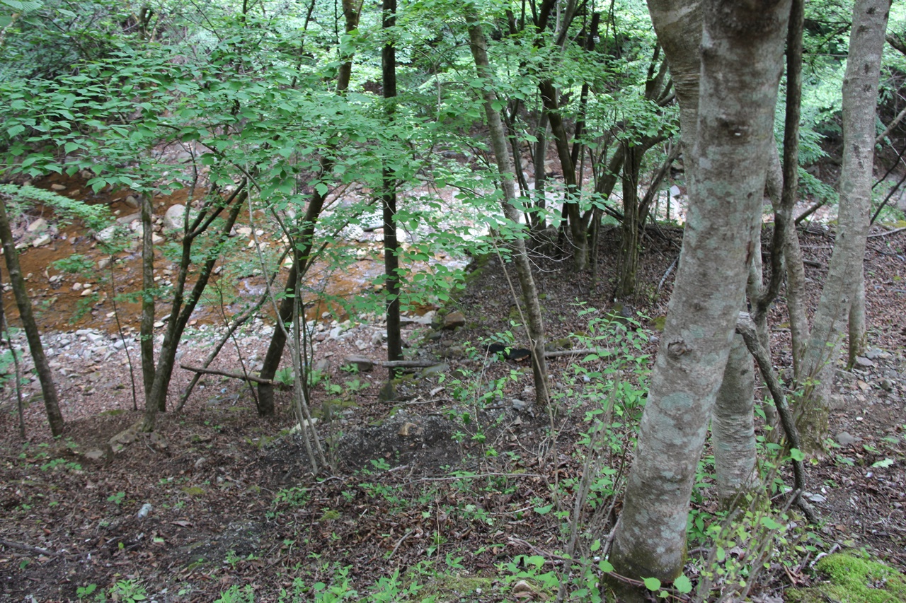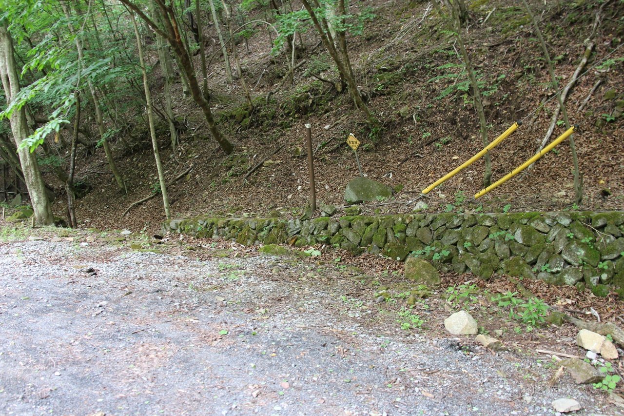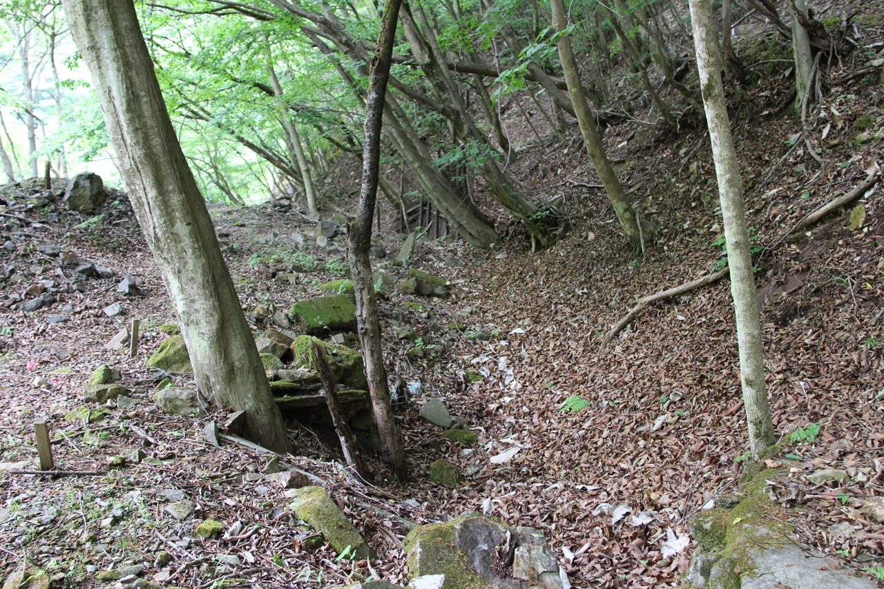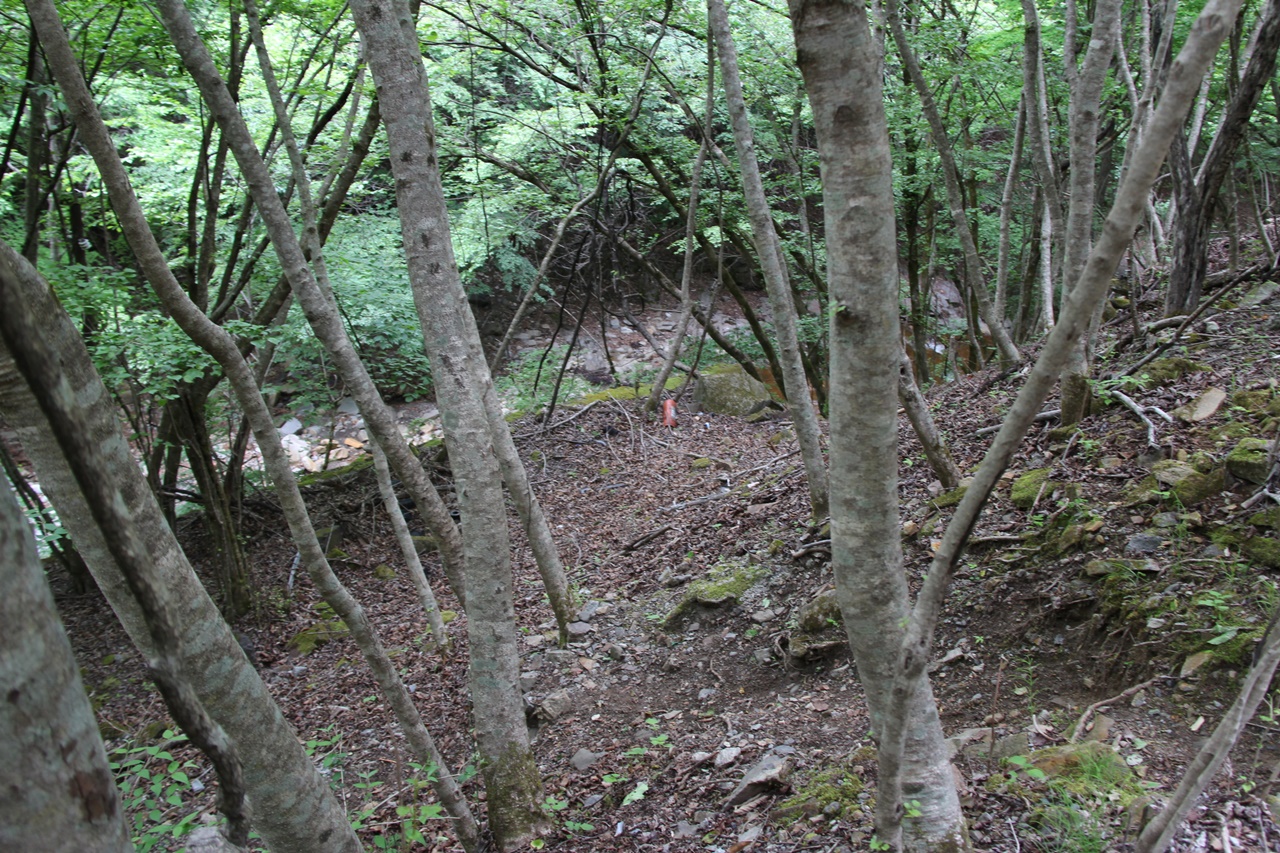 この土盛りの継ぎ目(沢になってしまっている)を伝って降りていきます。