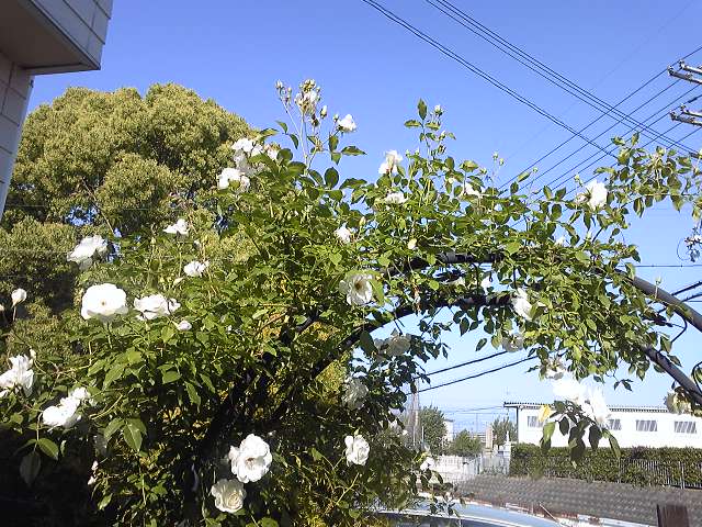 我が家のアイスバーグは3回目の春、ついにアーチを美しく飾ってくれました。2008年5月、一目ぼれして求めた苗でした。数輪だった去年に比べて今年は数え切れないくらいほど咲き乱れてくれています!^^剪定方法も適当だったしたいした世話もしていないのですが。アーチをくぐるとアイスバーグの甘い香りが漂います。苗はネットでも買えます。詳細はこちらの画像をクリック↓ ↓ ↓つるシュネービッチェン(アイスバーグ) 中輪 2年生バラ苗6号鉢植えつぼみがたくさんあって次々に咲いてくれそうで見ているだけで幸せな気持ちになります。やっぱり一年で一番この時期が好きです。悩みは地面に散る花びら。なるべく散る前にカットしようとはしているのですが^^;そして詳しく観察しているうちにヨトウムシがちらほら見つかりました。葉っぱが食べつくされて茎だけになっているんです。あえて写真は掲載しませんが、胴体は黄緑で顔が黒くて見た目はまるでニャッキです;お尻をピンと上げているスタイルが特徴的!可愛い?ようでにっくきヨトウムシです。 →顔が黒いのはチュウレンバチだそうです。ヨトウムシの幼虫が大きくなると顔が黒くなってくるのか?と思い込んでいました。しろぱんさん、ご指摘ありがとうございます。なるべく薬を使わずに手作業で除去しています。葉っぱは黒星病にかかっていて、薬を散布しても効果がありません。が、この病気は気にしなくていい、黒星病で枯れてしまうことはない、という専門家もいてちょっと安心しています。一年中咲いていてほしいなあ。