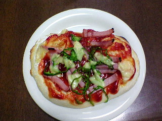 本当はクリスマスに挑戦してみたかったんですよ。でもそんな余裕がなくって。ようやく作ることができました。朝食には時間がないから、昼食用に作りました。ホームベーカリーの本を見て、その分量どおりにセットしました。オーブンはめんどうだから、オーブントースターです。途中でアルミホイルを上にかけたらいいやって思ってたのに、すっかり忘れてて少しこげちゃいました。オーブンより小さいものしか焼けませんが、生地を4等分にして厚めのピザとして焼くと、ちょうど1人前ぐらいのボリュームとなりました。Ponは家でピザが作れるっていうことが、とてもうれしかったようで、電話でおばあちゃんと話すときにもその話をしてました。「お母さんが、家でピザ作って焼いてくれたんでー。」って。たいしたことじゃないのに、こんなに喜んでくれるとまた焼こうかなって思います。単純な母です