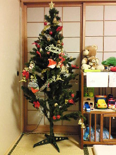 ようやくクリスマスツリーを出しました。去年はまだChapoがなんでも口に入れていたので、ファンヒーターの柵に板を置いて、その上に飾ったりして手の届かないよう工夫しましたが、今年は普通の場所で、PonとChapoに飾り付けを手伝ってもらいました。飾り付けをするのは初めてのChapoは、キラキラする飾りを見て大はしゃぎです。てっぺんのを抱っこしてつけさせると、「やったー、やったー」と万歳三唱してました。その後もしばらくは、手の届くところの飾りを取ったり引っ掛けたりしてニコニコと遊んでいました。リビングがせまくなるので和室に置いたのですが、障子と畳とツリーってヘンでしょうか。そうそう、ダンシングサンタさんがまだでした。これは、音がうるさくって去年は出さなかったんです。Chapoくん、はじめましてのサンタさん人形にどんな反応するかな