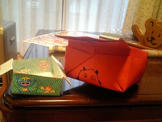 豆まきは、子供達手づくりの入れ物に豆を入れて、パパおにに向かって「おにはそとー!」