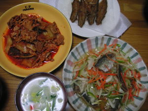 今日の晩御飯は「カレイの甘酢あんかけ」です。後は、かぼちゃの煮物と味噌汁です。カレイをから揚げにして、甘酢あんかけを掛けます。甘酢あんかけは、適当に作ったわりにかなり美味しかったです。写真撮るの忘れてて、ちょっと魚つついてしまったので、上に乗ってる白髪ねぎでつついたところを隠しての、写真撮影でした。