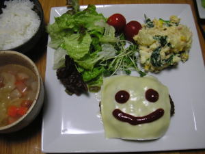 今日の晩御飯は「チーズハンバーグ」です。後は、添え野菜とポテトサラダとコンソメスープです。今日もワンプレートにしました。洗い物が楽です。ついこの前の実家の晩御飯がチーズハンバーグだったので、真似しました。ポテトサラダには、ジャガイモ、ほうれん草、コーン、ツナ缶、ゆで卵を入れました。実家のポテトサラダは昔から、ジャガイモ、きゅうり、ハム、ゆで卵といつも決まったものが入っています。実家のと同じ材料で作りたいのですが、買い忘れたり、きゅうりが高かったので、ほうれん草で代用したりとで、なかなか同じポテトサラダにならないですね。。