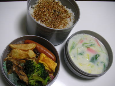 本日のお弁当です。【メニュー】・鯵の唐揚げ・ブロッコリーのゴマ醤油炒め・フライドポテト・ウインナー・卵焼き・白菜と水菜のミルクスープ夜勤最終日です。4日間ランチジャーで作ってみて・・・丸のお弁当箱は入れにくいですね。。どうやって入れたら、綺麗に入るか研究せねば・・