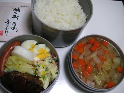 本日のお弁当です。【メニュー】・ハンバーグ・チーズはんぺん・ポテトサラダ・キャベツのバター炒め・ウインナー・ゆで卵・大根と人参のコンソメスープ朝・・・起きるのツライです。部屋のセラミックヒーターの自動電源が調子がいいと付くので、部屋が暖まって比較的起きやすいのですが、調子が悪いとつきません。。さっと、起きれるか起きれないかで、お弁当のおかずが一品多いか少ないかが決まってしまう、この頃です。