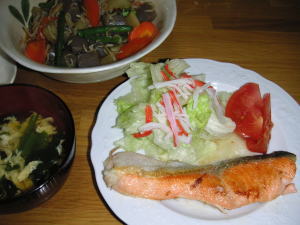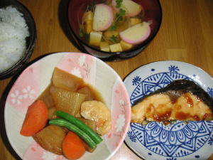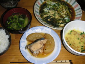 今日の晩御飯は「鮭のムニエル」です。後は、大根とじゃこの煮物と、ほうれん卵の澄まし汁です。大根とじゃこの煮物は、ちりめんじゃこにしっかり塩味が付いているので、香りつけ程度しか醤油は入っていません。さっと、お風呂掃除して入ろうと思ったら、何だかお風呂が生臭いというか、かび臭いというか、変な臭いがしたので、本気で掃除してしまいました。綺麗になったお風呂にゆっくり浸かって、冷えた体が温まりました。。