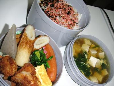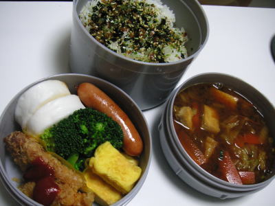 本日のお弁当です。【メニュー】・おでん(ちくわ・何かの揚げ天・こんにゃく)・ほうれん草のバター炒め・鶏のから揚げ・ウインナー・ブロッコリー・ほうれん卵のすまし汁おでんは、実家の母に貰ったものです。いつも助かっています。さて、ランチジャーの感想ですが・・かなり好評でした。スープもそんなに冷たくなかったようで、、何よりご飯がふっくらしていて美味しく食べれたようです。今までのお弁当箱は、ご飯をしっかり詰めていたので、結構ご飯はカチカチ。ランチジャーは、ふっくら入れられる上に、保温機能があるので、さらにふっくら。。夜勤の時は、夕食のスープを入れれるけど、昼勤の時は、作るのが困難な時がありそう。。インスタントのスープとか、沢山買っておこう。