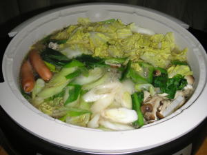 今日の晩御飯は「鍋」です。後は何もありません。この前に新年会をしたときの塩ちゃんこのだしの残りを使いました。何でも鍋です。ウインナーとか、小松菜とかも入っています。冷凍の豚肉と手羽元も入っていますが、魚介は入っていません。冷えた身体を中から温めてくれる鍋は最高です。