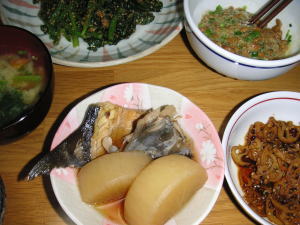 今日の晩御飯は「ぶり大根」です。後は、ほうれん草の胡麻和えと、れんこんの金平、味噌汁です。ぶり大根は、今シーズン2度目の登場です。昨日の晩からじっくり、あんまりブクブク沸騰させず煮込んだので、お汁が澄んだ透明の綺麗な仕上がりになりました。大根もぶりも煮崩れず、ほっこり炊き上がりました。美味しかったです。材料費も安いし、また作りたいですね。