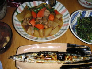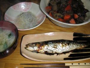 晩御飯は「秋刀魚」です。後は、煮物、ほうれん草の胡麻和え、赤だしです。この秋刀魚、スーパー広告の品でしたが、、かなり美味しかったです。生さんまに軽く塩を振って、グリルで焼きます。オーソドックスに大根おろしに醤油で頂きます。また、美味しい秋刀魚が手に入ればいいな~