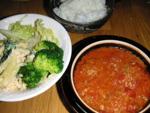今日の晩御飯は「トマト煮込みハンバーグ」です。後、マカロニサラダとコンソメオニオンスープです。トマトソースに沈んでハンバーグが見えませんね。トマトソースは、にんにく、玉葱をオリーブオイルで炒めて、色々調味料入れて作ってます。いろんな味がして美味しかったです。