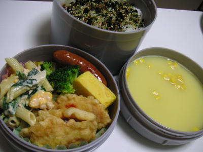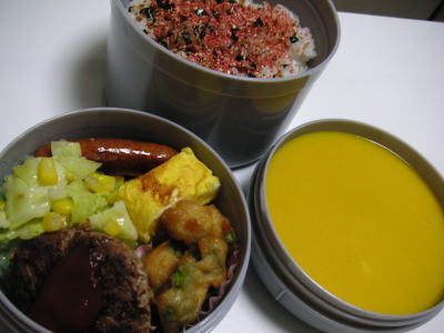 本日のお弁当です。【メニュー】・ハンバーグ・キャベツとコーンのバター炒め・枝豆天煮・ウインナー・卵焼き・かぼちゃのポタージュスープ昼勤最終日のお弁当です。何か今回の4日間は非常に長かった。。気がします。毎朝寒いので、すっきり起きれません。せめて少しでも早く寝て、シャキっと起きれるようにしたいです。